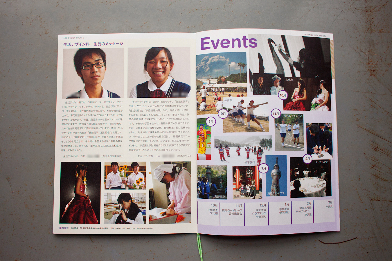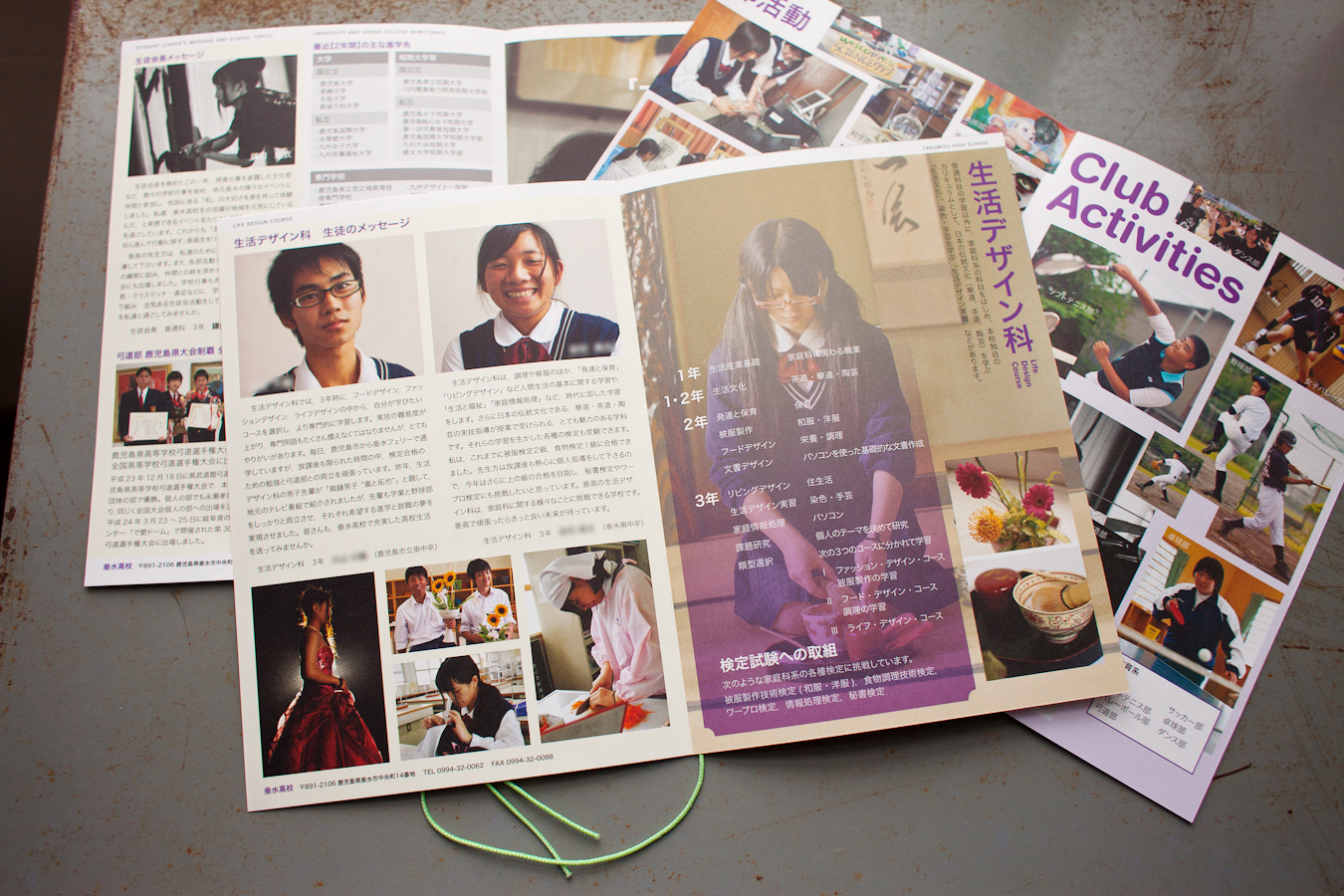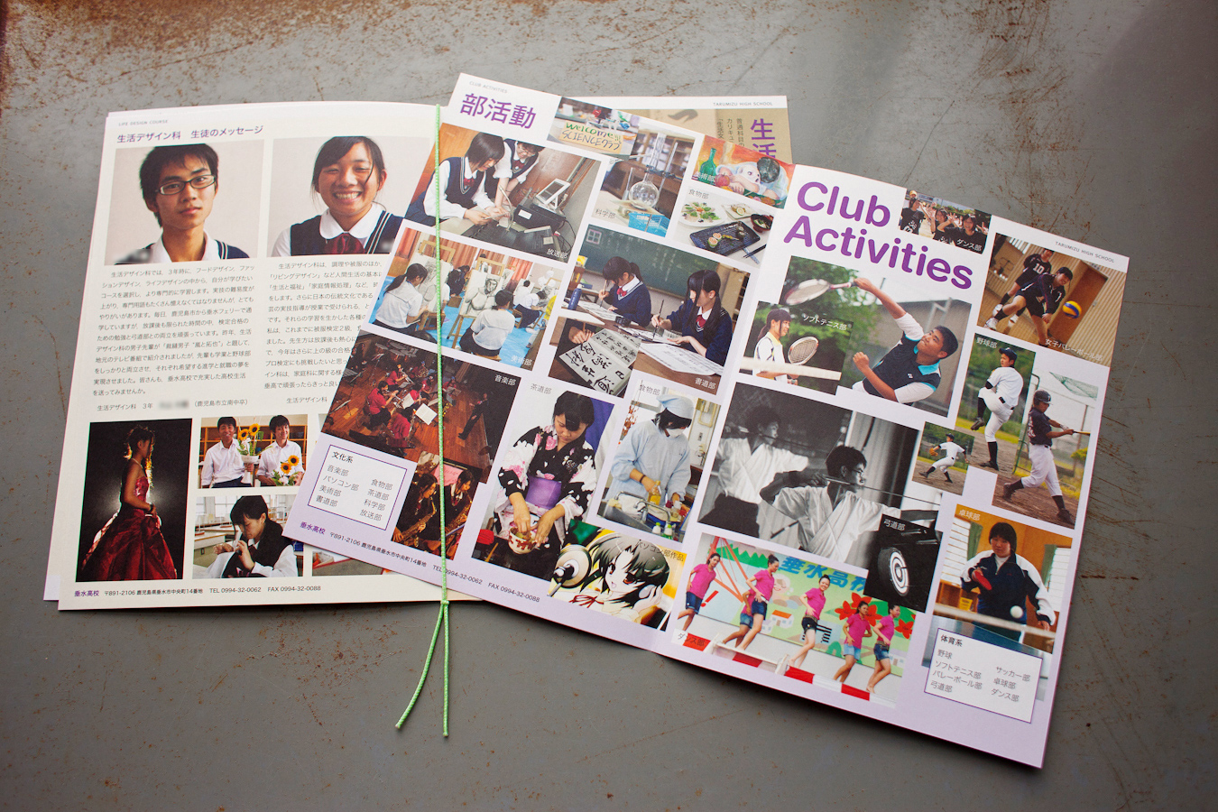 This promotion was targeted towards Junior High Schools in the immediate area, where teachers relay information about High School admissions to their student body and parents, ultimately requiring an appeal to three audiences. As many High Schools in Japan offer trade-specific courses alongside an academic (or college bound) course, it’s necessary to speak directly towards specific areas of interest to attract potential students. Through the use of original photography, dialogue, and student testimony, this brochure makes an effort to speak honestly about the possibilities both courses at Tarumizu High can offer.